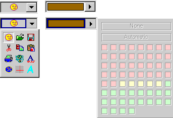 This depresses on the arrow just like those in Internet Explorer 5.0 and the latest common controls. (The top two buttons depress to show the Well controls at the bottom.) The controls can drop down (the control on the left) or drop "right". The Well controls can also be displayed in a disabled state (the control on the right).